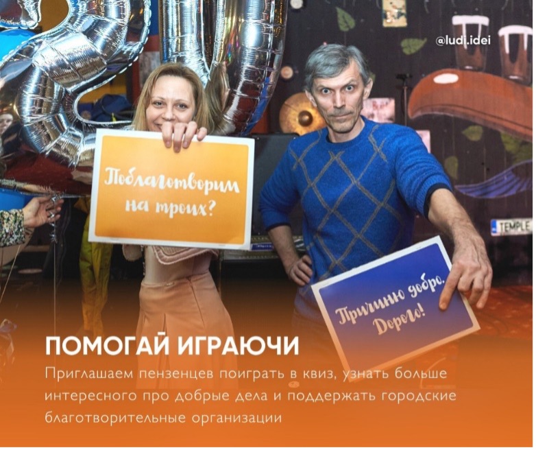 26 февраля, накануне Всемирного дня некоммерческих организаций, ОО Люди.Идеи, совместно с сообществом «Бизнес Леди Пенза» и известным пензенским ведущим Александром Самойлиным, проводит благотворительный квиз.