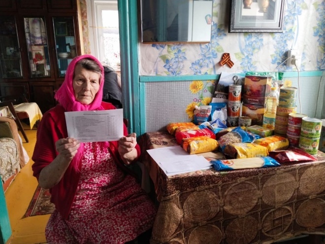 Нина Михайловна держит в руке листок со списком доставленных бесплатных продуктов, перебирает пакеты, баночки и едва удерживается от слез. Привезли самое необходимое — крупы, консервы, сахар, макароны и другие припасы, которые помогут месяц, а то и больше продержаться не на голодном пайке.