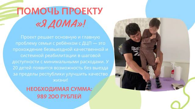 Проект «Я дома» решит основную и главную проблему семьи с ребёнком ДЦП — это прохождение безвыездной, качественной и системной реабилитации в шаговой доступности у себя дома с минимальными расходами. Необходимая сумма сбора: 989 200 рублей. Усилиями родителей было собрано: 410 000 рублей. Общая сумма за аренду помещения, проживание, авиабилеты и оплату услуг специалистов составляет: 1 399 200 рублей.